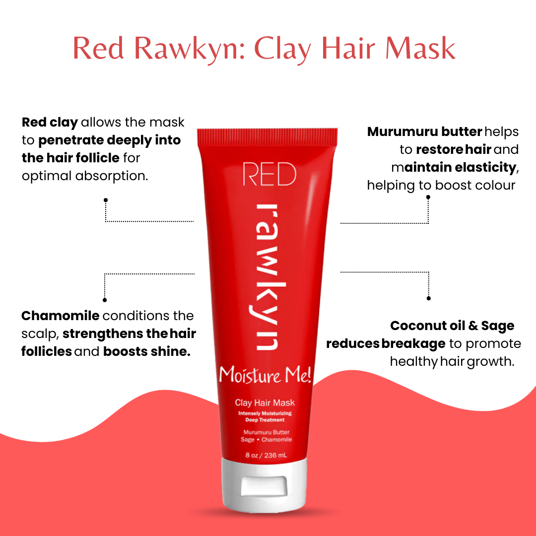 Looking for Protein- Moisture balanced product? Red Rawkyn, #YourSpaAtHome is an intensely moisturizing deep conditioning treatment with red clay. The clay, our STAR ingredient, allows the mask to penetrate deeply into the hair follicle which promotes optimal absorption. Our mask is infused with murumuru butter, chamomile, coconut oil and sage. Red Rawkyn feels like butter as it melts into your hair working it's magic with a fresh apple scent.