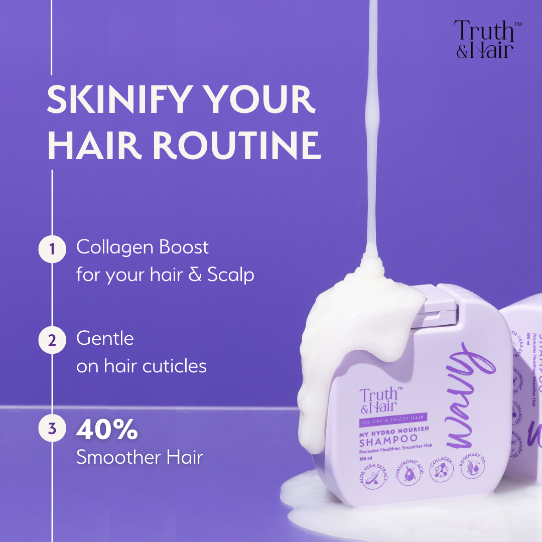 Introducing our Hydro nourish shampoo tailored to celebrate your wavy hair—a gentle, sulfate-free, clinically-tested elixir curated to cleanse your scalp and lavish your locks with hydration. Infused with the nurturing properties of Rosemary oil & Murumuru Seed Butter and the vibrant energy of Marshmallow Root & Sunflower Seed Oil, this formula whispers vitality to each strand. The bond of Aloe vera, Hydrolyzed Collagen, and Hyaluronic Acid is the secret handshake that will work behind the scenes to nourish your waves with an unmatched bounce and resilience. Beyond their immediate benefits, these ingredients intertwine to enrich not just your hair but also your scalp's well-being ensuring long-term health and elasticity. This is your secret to unleashing the true beauty of your waves as they embrace a newfound smoothness and strength.